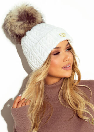 Naturalny pompon z jenota dodaje objętości i elegancji, a subtelne, złote logo LoveYa umieszczone z przodu podkreśla markowy charakter dodatku. Biały kolor pięknie rozjaśnia stylizację i doskonale komponuje się z płaszczami, kurtkami puchowymi oraz dzianinowymi kompletami w neutralnych i karmelowych odcieniach.