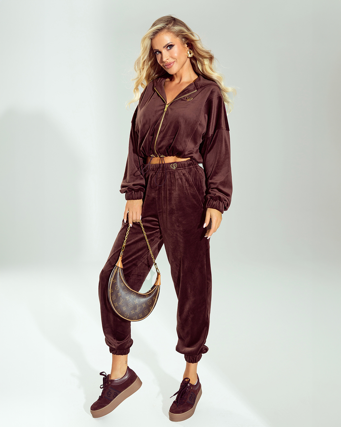 Brązowy komplet dresowy Candy to połączenie wygody, kobiecości i nowoczesnego stylu. Wykonany z przyjemnego w dotyku weluru, doskonale wpisuje się w trend eleganckich dresów premium.