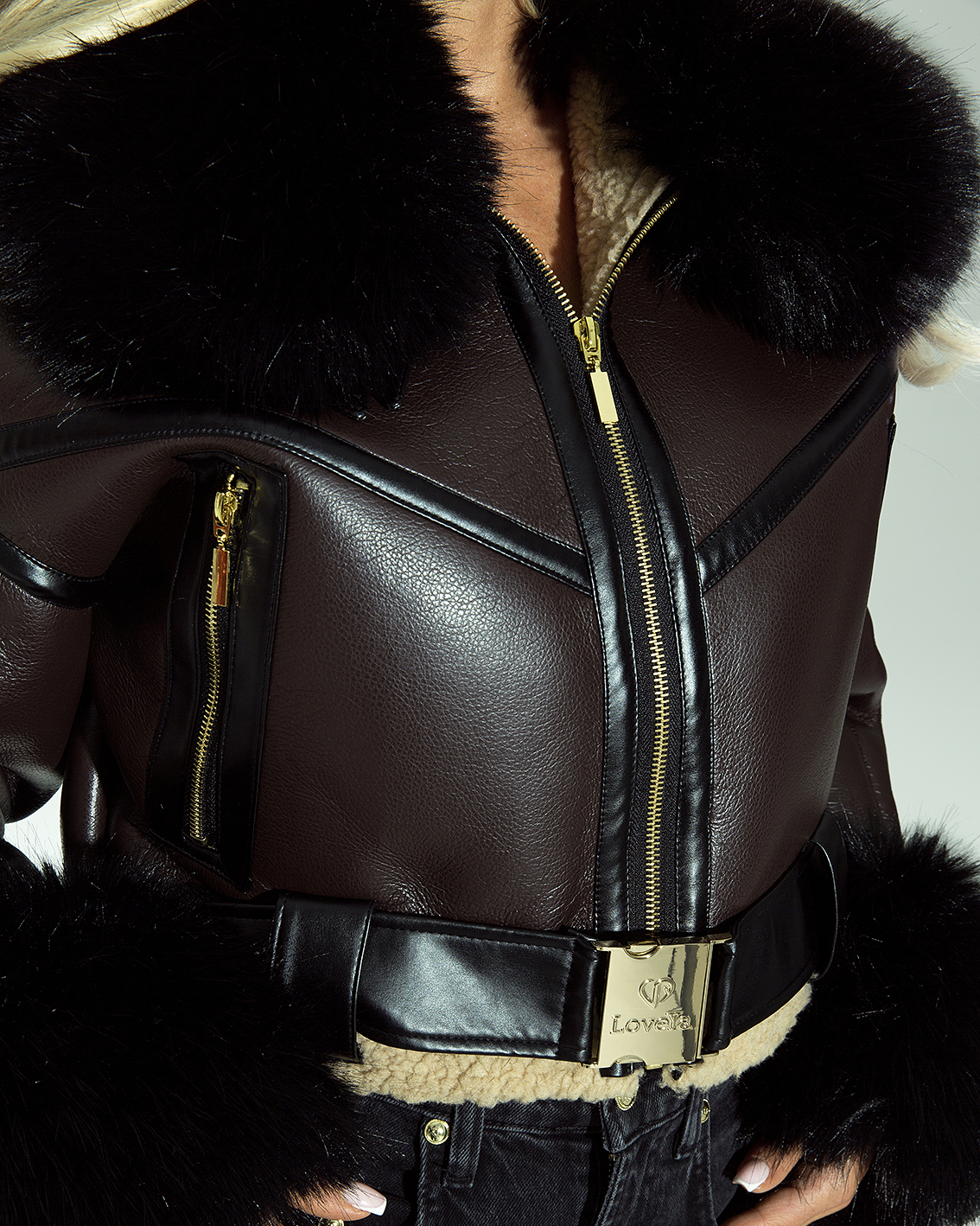 Brązowy kożuch Luis z naturalnym obszyciem to wyjątkowy model z kolekcji LoveYa, który wyróżnia się niepowtarzalnym charakterem. Elegancki, szeroki kołnierz oraz mankiety zostały ozdobione puszystym, naturalnym futrem w odcieniu ciemnego brązu, co dodaje całości wyrafinowania i ekskluzywnego stylu. Konstrukcja kurtki została zaprojektowana tak, aby pięknie modelować sylwetkę – pasek w talii z logo LoveYa subtelnie podkreśla proporcje, a złote detale nadają szykownego blasku. Funkcjonalne kieszenie na suwak oraz ciepłe podszycie sprawiają, że kożuch Luis to idealny wybór na chłodne dni. Model został uszyty w Polsce z dbałością o każdy detal, co czyni go inwestycją w styl i komfort na lata.