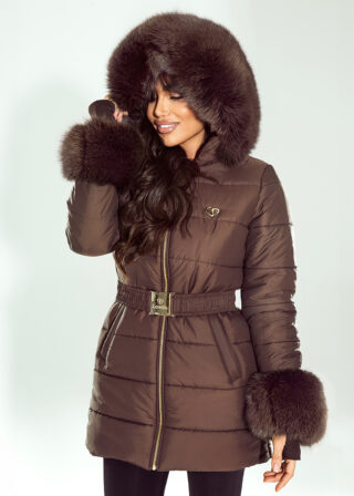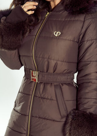 Brązowy pikowany płaszcz Lucrezia z naturalnym obszyciem z lisa zachwyca perfekcyjnym wykonaniem i wyrafinowanym designem. Pikowany materiał o satynowym połysku doskonale komponuje się z naturalnym futrem z lisa, zdobiącym kaptur oraz mankiety. Dopasowany krój pięknie modeluje sylwetkę, a elastyczny pas z klamrą LoveYa subtelnie podkreśla talię. Płaszcz jest nie tylko elegancki, ale też praktyczny – ciepły kaptur, solidny zamek i głębokie kieszenie zapewniają wygodę podczas zimowych dni. To model stworzony dla kobiet, które cenią styl, klasę i komfort. Produkt zaprojektowany i uszyty w Polsce.