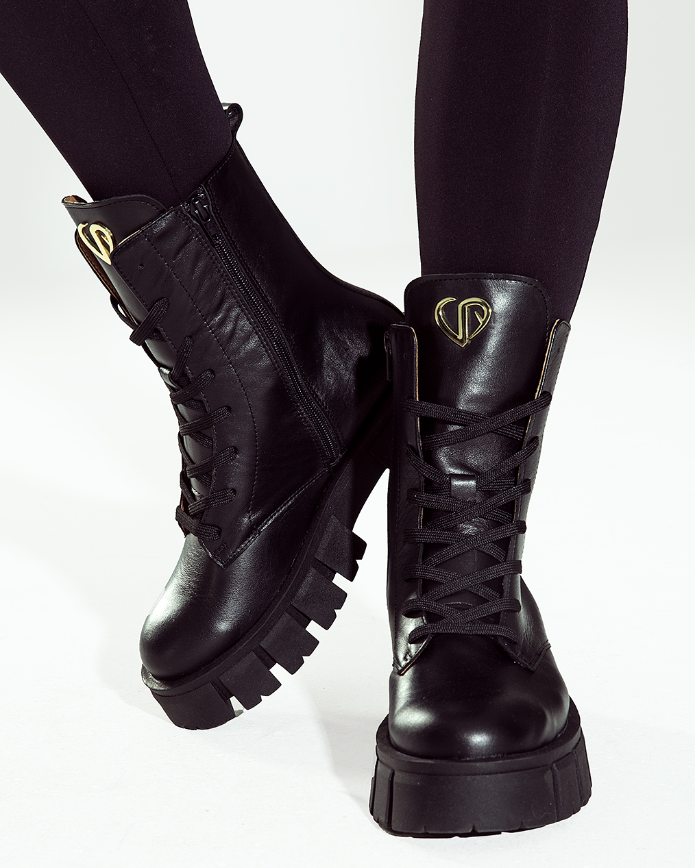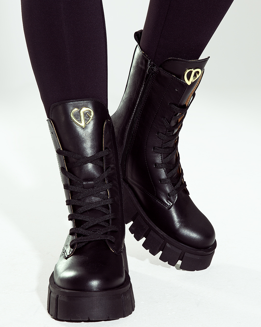 Czarne trapery Mirra to propozycja, która łączy kobiecy szyk z nutą miejskiego pazura. Solidna podeszwa typu traper gwarantuje stabilność i komfort noszenia, a miękka cholewka dopasowuje się do stopy, zapewniając wygodę przez cały dzień. Złote detale – w tym logo LoveYa umieszczone na języku buta – dodają całości luksusowego charakteru. Model Mirra doskonale prezentuje się zarówno w połączeniu z kurtką puchową, jak i z ramoneską czy płaszczem. Idealne buty na jesień i zimę, zaprojektowane z dbałością o detale i stylowy wygląd.