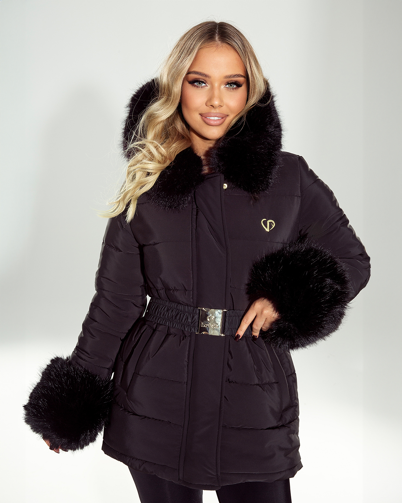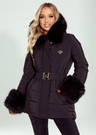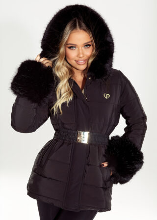 Czarny płaszcz Aaliyah ze sztucznym obszyciem to połączenie elegancji i nowoczesnego designu w klasycznym, ponadczasowym brązie. Pikowana struktura pięknie modeluje sylwetkę, a szeroki, elastyczny pas z ozdobną klamrą LoveYa podkreśla talię i dodaje kobiecego wdzięku. Pojemne kieszenie z ozdobnymi guzikami nadają mu praktyczności, a złote detale – luksusowego charakteru. Ciepły kaptur ze sztucznym futrzanym obszyciem zapewnia komfort w chłodne dni, a całość idealnie komponuje się z dopasowanymi legginsami lub jeansami. Produkt zaprojektowany i uszyty w Polsce, z dbałością o każdy szczegół.