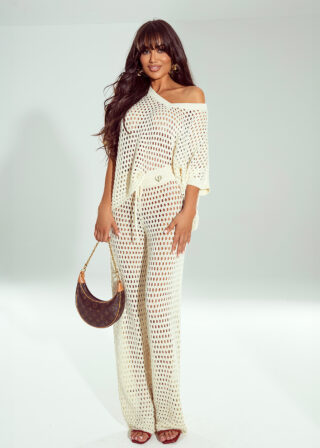 Ażurowy komplet Solare ecru to stylowa, ażurowa stylizacja składająca się z oversize’owej bluzki i spodni o prostej nogawce. Idealny na lato, plażę i wakacyjne wyjazdy.