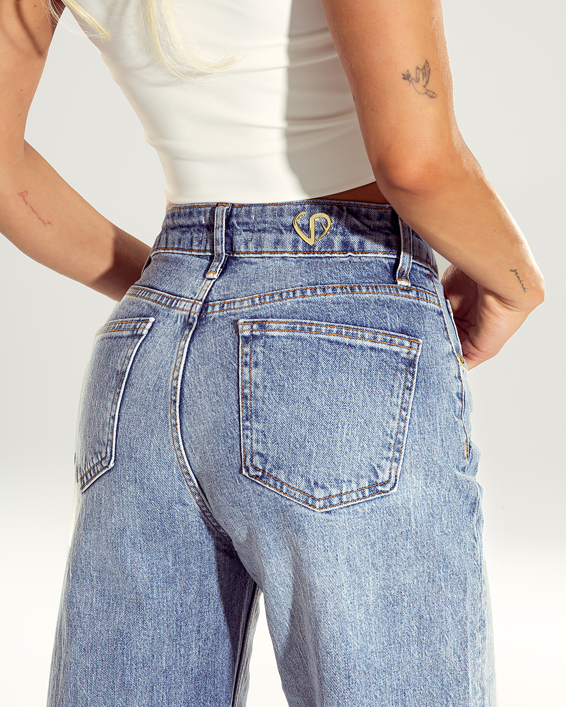 Denim w spranym, klasycznym odcieniu sprawia, że model Romy doskonale komponuje się z każdym kolorem i stylem – od casualowych zestawów z T-shirtem po eleganckie połączenia z koszulą i szpilkami. Złote, logowane detale dodają im subtelnego, luksusowego akcentu, podkreślając markowy charakter produktu.